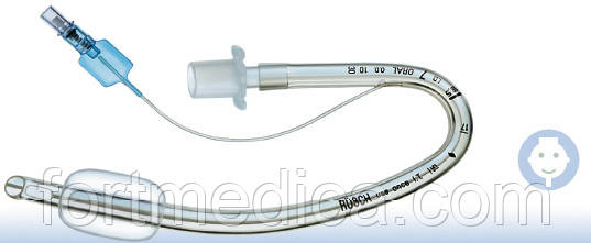 AGT трубка з RUSCHELIT для оральної інтубації, силіконізована, не містить латексу, манжетка низького тиску, наполовину вставлений конектор, блакитний пілот-балон, клапан для шприців Luer і Luer-lock, R #246;-маркер, рентгенівське маркування по всій довжині, розмітка, закруглений атравматичний наконечник, тип Murphy. Стерильно.
